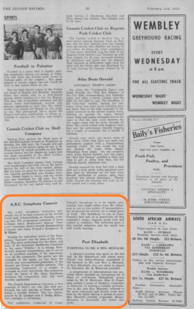 The research started as a PhD-project, which I conducted at Stellenbosch University between 2015 and 2019. A by-product of the PhD project is a database of music reportage that is currently available on Stellenbosch University’s digital repository and that is compiled in collaboration with the National Library of South Africa. The objective of this database-project is to create an inclusive and wide-reaching digital archive of South African Jewish writing about music during the twentieth century. At present, the database houses 4964 music-related items that appear in the South African Jewish Chronicle and the Zionist Record newspaper publications of between 1905 and 1948.